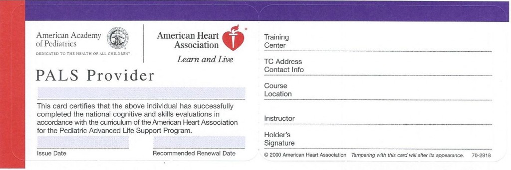 Our organization offers a standard 14-hour PALS training course taught by certified PALS instructors. Participants who pass both the written and practical examinations will receive the American Heart Association Pediatric Advanced Life Support certificate, which is valid for two years.
